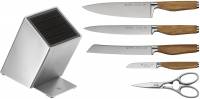 | A csomagolás tartalma | 1x késblokk, 1x séf kés 20 cm, 1x húsvágó kés 20 cm, 1x kenyérvágó kés 19 cm, 1x zöldségvágó kés 9 cm, 1x olló |
